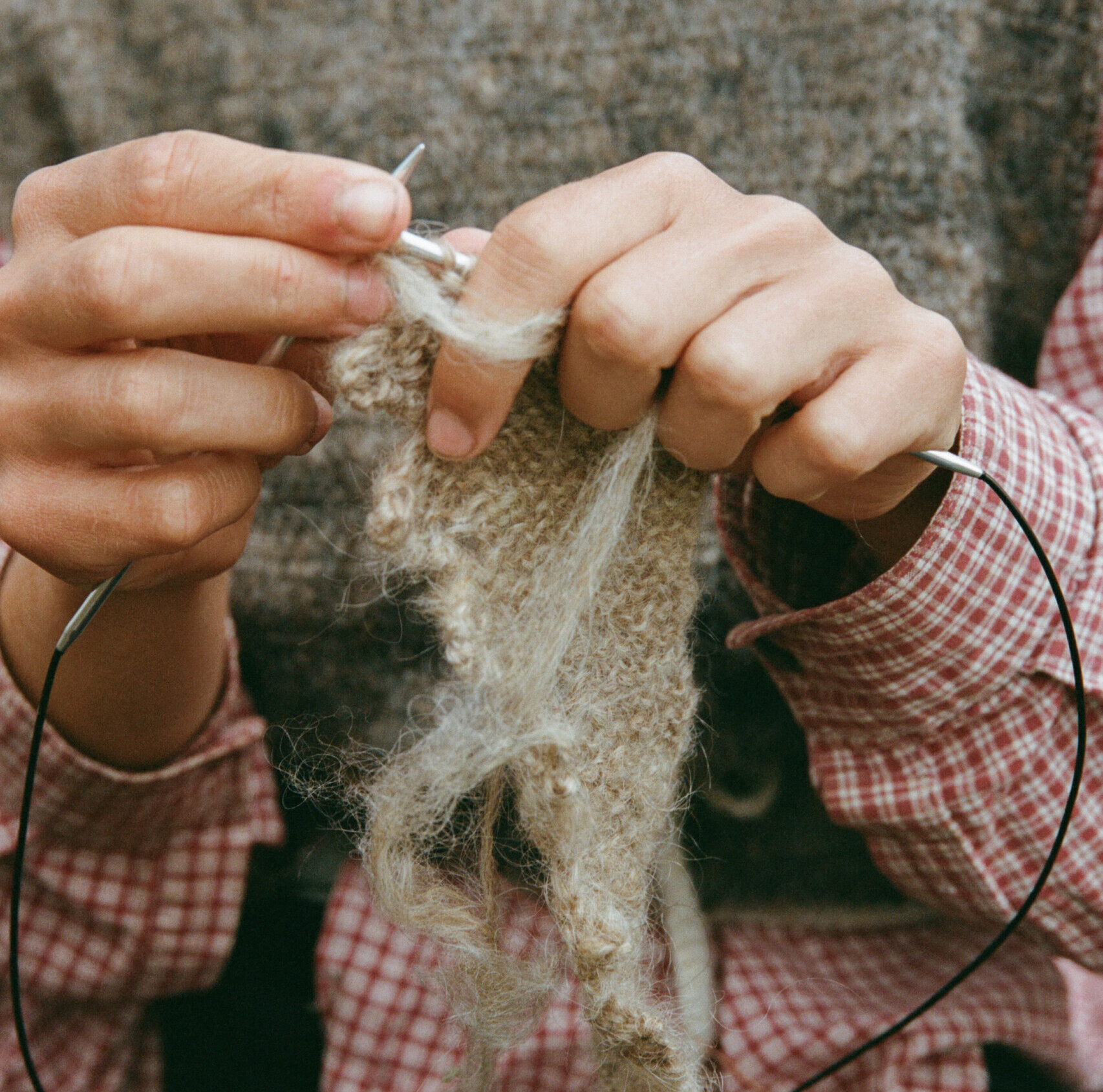 Dogmestrik forbinder sig til gammelt håndarbejde, og der opstår naturligt en relation til materialet. I løbet af workshoppen fortæller Liva Steuk Hansen om uldtyper, uldens egenskaber og brugsområder og om, hvordan får, landskab og tekstil hænger sammen.